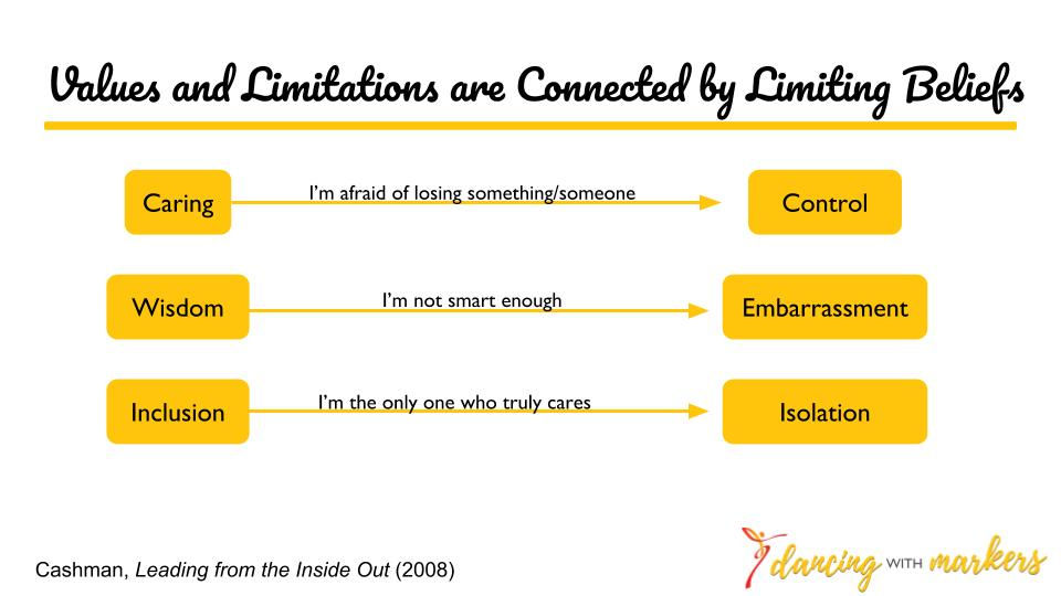 In Leading from the Inside Out, Cashman talks about the link between values and limitations. When a shadow belief or negative mindset is in play, it can cause our values to show up as bad behaviors. For example, I value compassion for others, but when I tell myself that, "I have to be right," I might show up to others as controlling. If you're a mother, you might relate to this feeling.